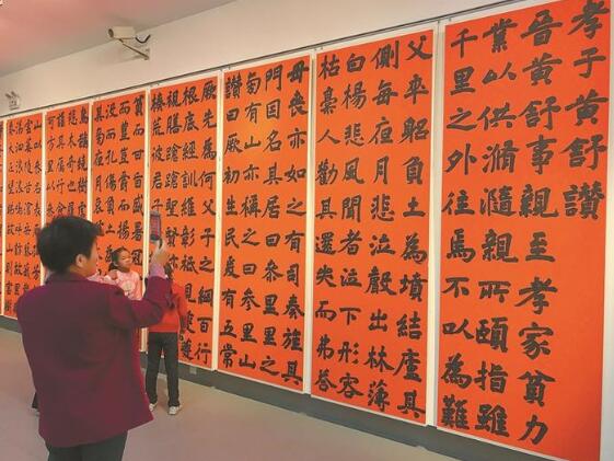 據(jù)了解,此次展覽不同于普通的書法展,而是以“孝德”為內(nèi)容的主題創(chuàng)作展,所有作品都圍繞孝文化進(jìn)行創(chuàng)作,每一幅作品都在講述一個(gè)關(guān)于孝文化的故事。在“孝德”大主題下,又分了幾個(gè)小專題,比如“二十四孝專題”“孝經(jīng)專題”“金石題跋專題”,還有本土的“孝德寶安專題”。當(dāng)天的展覽吸引了大量觀眾,不少觀眾還帶著小孩參觀,黃女士告訴記者,“今天帶著小孩來,一是欣賞書法,二是希望小孩了解一下傳統(tǒng)的孝德文化,我們通過書法還了解到寶安孝子黃舒的故事。”