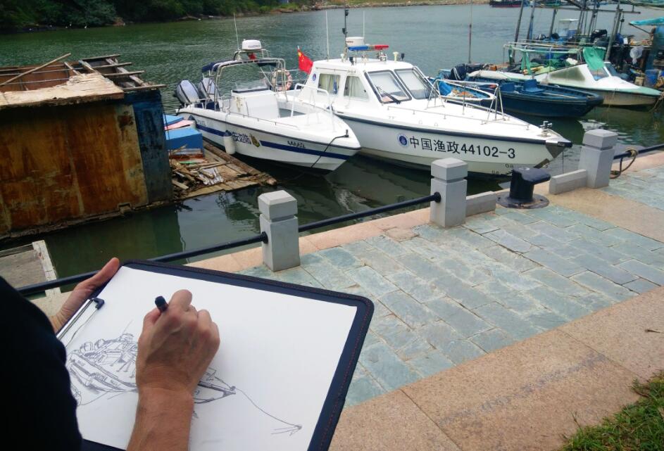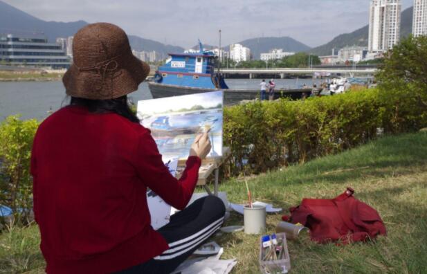 優(yōu)美的景色映入畫家們眼簾,點燃了他們的創(chuàng)作激情。來到鹽田之后,藝術(shù)家們紛紛找好寫生地點,擺好畫架,迅速進入創(chuàng)作的狀態(tài)。他們當中一部分來到了鹽田漁港,鹽田海鮮街后的小漁村避風港。蔚藍的大海、旁邊的綠樹、避風塘內(nèi)停泊的船只、白色的海鳥、釣魚的人以及遠方火熱的建設(shè)場景都呈現(xiàn)在畫家的筆端;另一部分藝術(shù)家來到了位于三洲田深圳會計進修學院的梧桐溪谷,小橋流水人家、奇石山林則一一被傾注于畫紙。