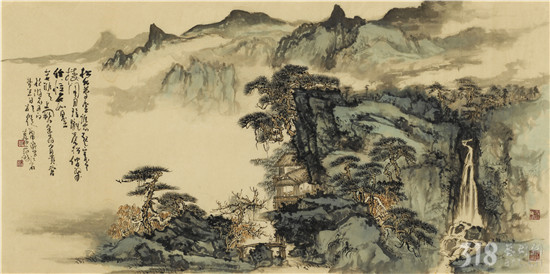 范陽先生的山水畫,筆法近取傅抱石、黃秋園,遠(yuǎn)溯“元四家”中黃公望、王蒙。筑居楊岐山下,使先生日夜親近自然山水,吐納天地,養(yǎng)浩然之氣。“外師造化,中得心源”,唐代張璪一言道破了山水畫家修養(yǎng)、悟性的不二法門。范陽先生正是以自然(造化)為營養(yǎng),入而為心靈化育,镕冶成亦古亦新,遠(yuǎn)離塵俗的獨特風(fēng)格。近作《松風(fēng)泉聲》(五屏聯(lián))氣勢磅礴,大開大合,細(xì)究又十分謹(jǐn)嚴(yán)。筆墨與丘壑融為一體,既豪放又穩(wěn)健。淺絳青綠的設(shè)色,使畫面有蔥翠欲滴之感??胺Q山水畫中的經(jīng)典。