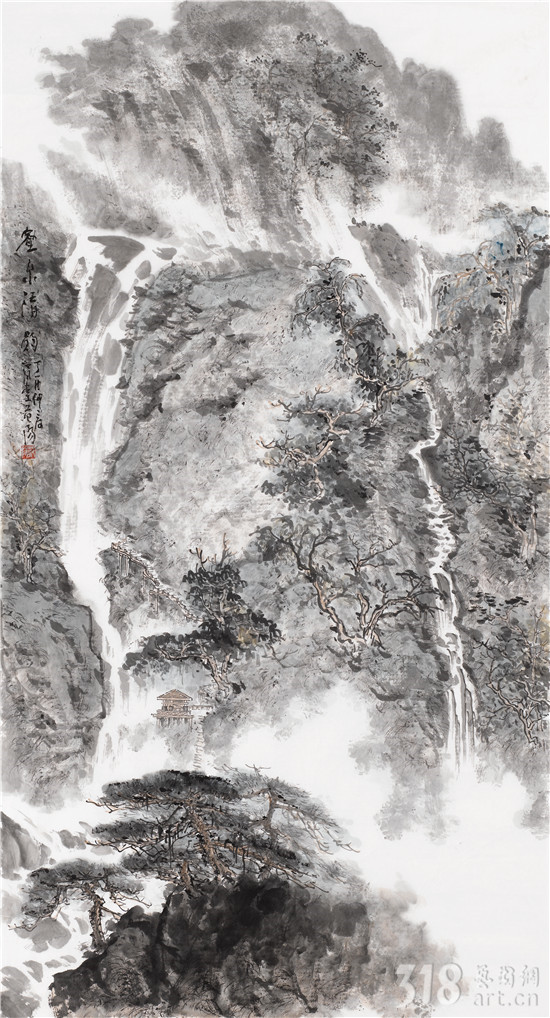 山水之所以成為中國繪畫的永恒主題,跨越時空,也在于“自然”這一永恒主題是人類心中的凈土。與卡拉揚所說的以巴赫音樂“校正視聽”同出一轍,山水藝術(shù)家籍借山水畫,作為修煉自我的一條途徑。與音樂一樣,山水畫既有抽理的邏輯,又有造化的邏輯。師造化能有溫度,抽理能讓我們的心靈得到升華與純凈,我們的手、眼、心在師造化和抽理中,最后達(dá)到師物游心、物我兩忘之境。范陽先生終年隱居江西武功山和楊岐山,師造化使他筆下的丘壑、林泉、松石,高曠而有真意,不落程式窠臼。早年潛心古法研究,謙遜問學(xué),轉(zhuǎn)益多師。門庭既闊,筆墨則不得不精,眼界既寬,格調(diào)則不得不高。近年的作品,更從早年的細(xì)膩綿密,化而為奔放渾厚。其畫不論大作或小品,首取氣韻,不營營于一草一木,放逸中卻又能見綿密細(xì)致。又以草情筆法入畫,于平直處流露其錚錚骨骼及磊磊性情,飛動處可見其心瀾翻動,觀其作,可想見其作畫時心手雙暢之態(tài),如汩汩之泉,一瀉千里而不得止,非長年積養(yǎng)之功不可得哉。