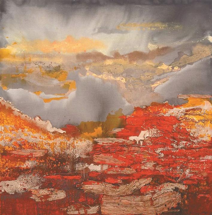 近年來,鄒明也嘗試用綜合材料來表現(xiàn)都市水墨。此次展出的部分作品呈現(xiàn)了他在這一領(lǐng)域的成果。譬如《大漠殘陽》《隙》《生命守望》等作品中可見他在材料上的大膽探索。這些作品用色大膽,筆觸粗獷,偏向當(dāng)代藝術(shù)。
