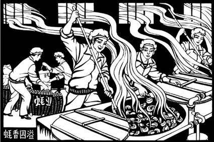 饒凱玉從來沒學(xué)過國畫,也沒接受過正規(guī)的美術(shù)教學(xué)。在集訓(xùn)一個(gè)月期間,老師給她一本書,建議她向國畫發(fā)展。她發(fā)現(xiàn)書里有幾幅小剪紙圖很有趣,突然勾起她的創(chuàng)作靈感,為什么不畫農(nóng)村題材呢?她決定創(chuàng)作農(nóng)村“四員”(出納、會計(jì)、保管、記工員),“四員”是當(dāng)時(shí)典型的社會人物?!拔也灰媷嫞碳埑僧?。”饒凱玉說。當(dāng)時(shí),她先用毛筆在紙上勾勒出形象,修改定稿,后用印寫紙反轉(zhuǎn)復(fù)印在刻紙上,再用刀刻紙成畫。