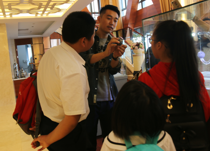 在現(xiàn)場,此次展覽的合作方——上海雍荷堂香館和深圳望野博物館呈現(xiàn)了數(shù)十件珍稀沉香藝術(shù)品和館藏香器珍品。來自深圳望野博物館的程海龍老師和上海雍荷堂香館的湯益強(qiáng)老師分別給小記者們現(xiàn)場講解了參展文物的歷史和相關(guān)知識(shí),同時(shí)湯益強(qiáng)老師還給小記者們做了傳統(tǒng)的香道技藝表演。