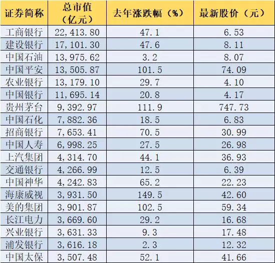 據(jù)匯大數(shù)據(jù)終端統(tǒng)計(jì),截止到今年3月20日,中國平安的市值為1.35萬億,僅次于工商銀行、建設(shè)銀行和中國石油。在市值排名前20名的公司中,去年全年股價(jià)漲幅在100%以上的公司僅有4家,分別是??低?、貴州茅臺、美的集團(tuán)和中國平安,漲幅分別為149.5%,111.9%、102.5%和101.5%。