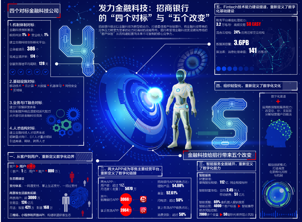 文化及體制機制創(chuàng)新先行,具體落地也就成了順理成章之事。招行希望“以科技敏捷帶動業(yè)務敏捷”,除創(chuàng)新機制建設外,還著力在基礎設施、IT與業(yè)務融合、人才結構轉型等三個方面全面對標金融科技企業(yè)。在基礎設施方面,著力提升IT基礎能力,在移動技術、云計算、大數(shù)據、機器學習、網絡安全、區(qū)塊鏈等領域加大投入,推動招行金融科技基礎設施向互聯(lián)網轉型。