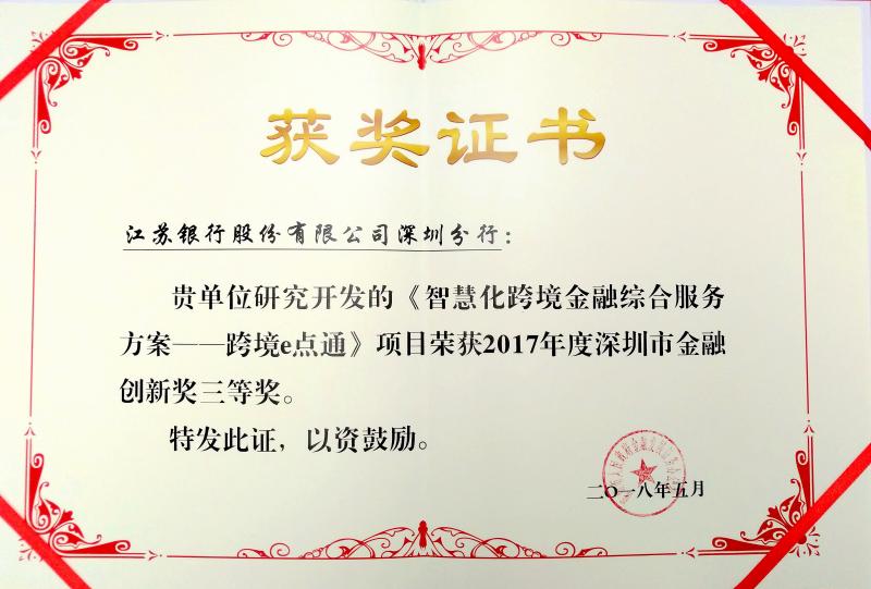 日前,深圳市政府2017年度金融創(chuàng)新獎(jiǎng)評(píng)選結(jié)果揭曉,江蘇銀行深圳分行“智慧化跨境金融綜合服務(wù)方案—跨境e點(diǎn)通”項(xiàng)目斬獲三等獎(jiǎng),這是該行連續(xù)四年獲得金融創(chuàng)新獎(jiǎng)后再次獲此殊榮,該行也由此成為深圳地區(qū)唯一一家五次榮獲金融創(chuàng)新獎(jiǎng)的城商行。
