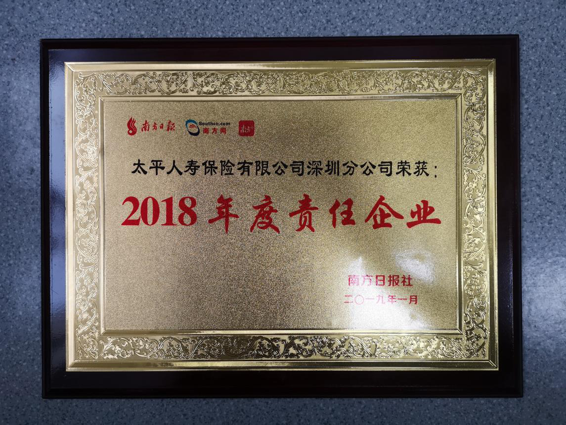 萬(wàn)人點(diǎn)贊!太平人壽深圳分公司榮獲“2018年度責(zé)任企業(yè)”