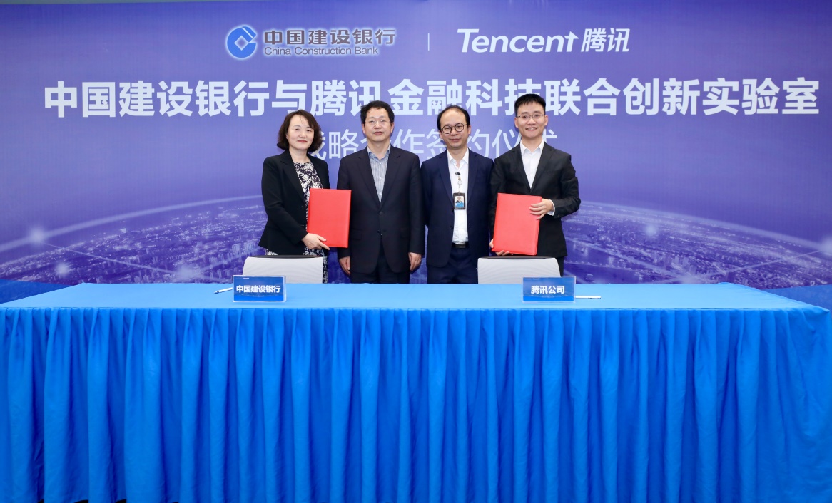 建設(shè)銀行副行長張立林、騰訊集團(tuán)副總裁鄭潤明見證,建設(shè)銀行金融科技部總經(jīng)理朱玉紅、騰訊云副總裁王慧星代表雙方簽約