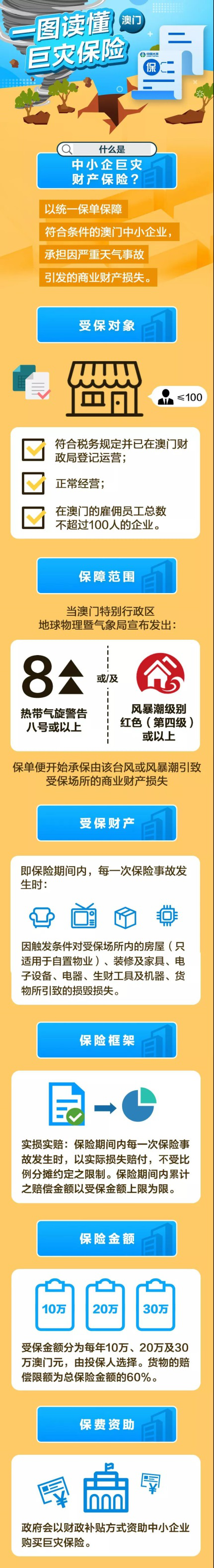 7月31日,今年首個(gè)臺(tái)風(fēng)“韋帕”來襲,香港、澳門氣象部門相繼懸掛8號(hào)風(fēng)球,并發(fā)布黃色風(fēng)暴潮警告。在持續(xù)強(qiáng)降雨和大風(fēng)之際,澳門金融管理局和經(jīng)濟(jì)局舉行聯(lián)合新聞發(fā)布會(huì),宣布推出“中小企巨災(zāi)財(cái)產(chǎn)保險(xiǎn)”,為中小企業(yè)在8號(hào)風(fēng)球/紅色風(fēng)暴潮或以上警告期間,所遭受的商業(yè)財(cái)產(chǎn)損失提供保險(xiǎn)保障。中國太平旗下太平澳門簽出中小企巨災(zāi)財(cái)產(chǎn)保險(xiǎn)第一單,為當(dāng)?shù)刂行∑髽I(yè)帶來定心丸。