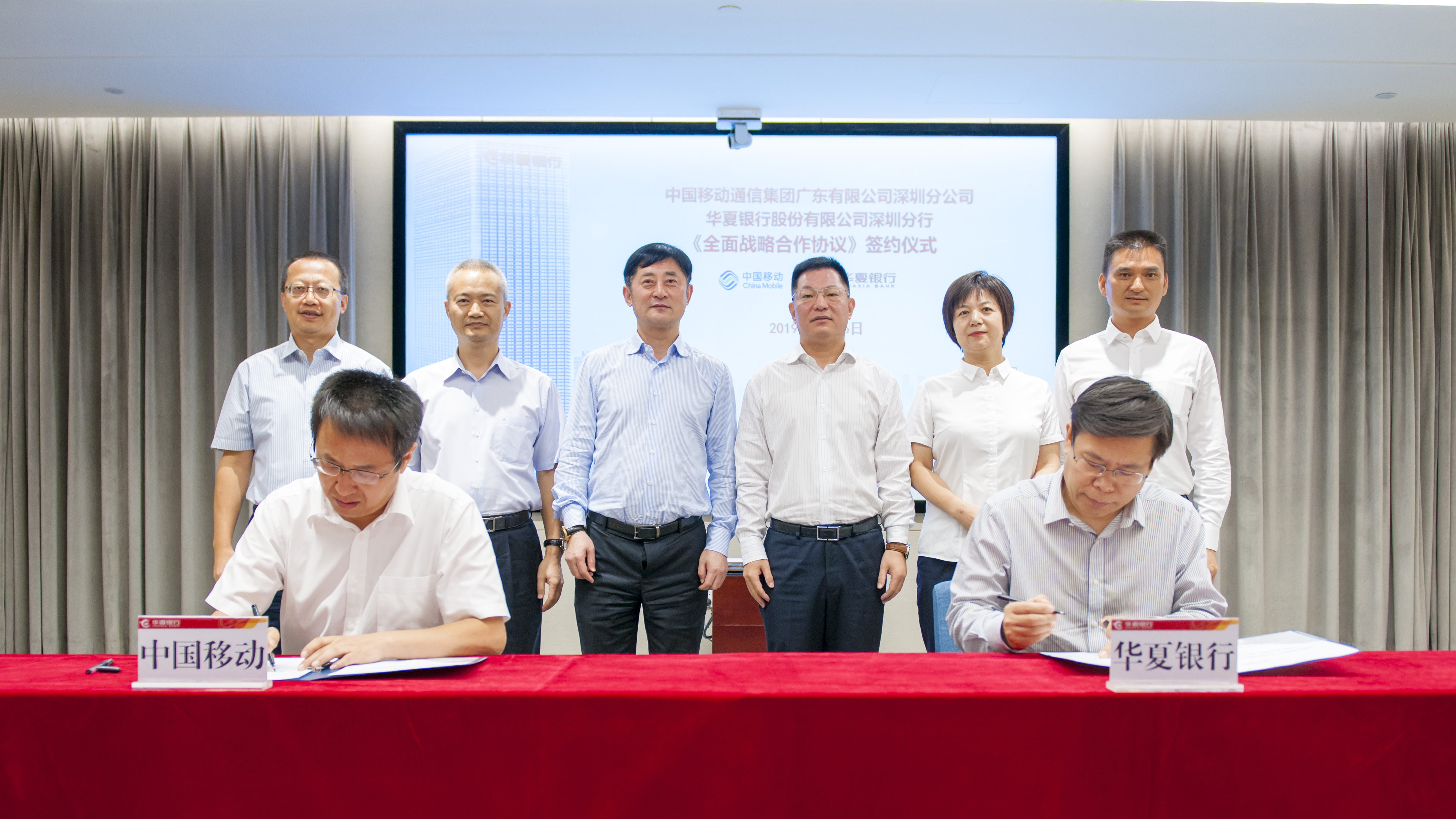 深圳新聞網(wǎng)2019年8月16日訊 近日,華夏銀行深圳分行與中國移動通信集團(tuán)廣東有限公司深圳分公司簽訂《全面戰(zhàn)略合作協(xié)議》,華夏銀行黨委委員、深圳分行黨委書記、行長陳傳龍與中國移動通信集團(tuán)廣東有限公司黨委委員、副總經(jīng)理祿杰等有關(guān)領(lǐng)導(dǎo)共同見證了協(xié)議簽署。