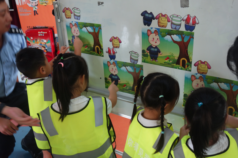 熊警官從交通工具講起,分別講述了乘坐不同交通工具所帶來的風險及注意事項,并通過幽默風趣的“兒童安全座椅”小視頻,提醒在座的小朋友及家長要注意細節(jié),具有防范風險的意識。在互動游戲環(huán)節(jié),熊警官通過與小朋友們的互動,講解了紅綠燈的來源、日常的交通標識以及過馬路的規(guī)則?,F(xiàn)場的同學們也非常踴躍,在“被看見才安全”環(huán)節(jié)時,許多小朋友主動上臺,給小兔子穿上最亮最顯眼的衣服,使其成為最靚的仔。