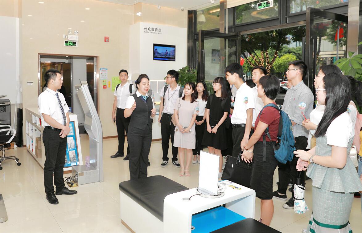 開放日活動的第二站,同學們來到沙井支行營業(yè)部、沙井坣崗支行和福田支行營業(yè)部學習了銀行營業(yè)網點功能區(qū)布局、窗口設置、營業(yè)場所裝飾、智能設備配置及人員安排等情況,對銀行營業(yè)網點的工作環(huán)境有了更直觀的感受和體驗。特別是在參觀沙井東塘支行的員工宿舍“職工之家”時,同學們對這個占地1500平米、總建筑面積3200平米的獨立大院由衷贊嘆,向往不已。