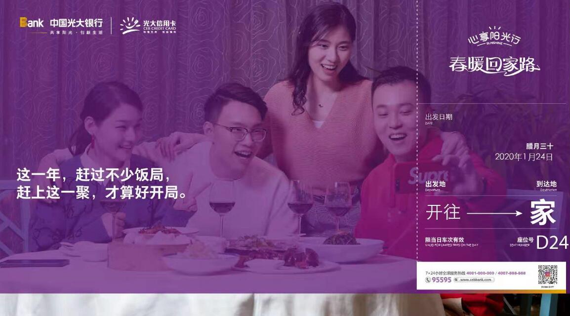 此次“春暖回家路”活動(dòng)將在全國(guó)多地同步開(kāi)展,圍繞餐飲、出行、娛樂(lè)等多種春節(jié)期間關(guān)鍵場(chǎng)景,光大信用卡推出十余個(gè)優(yōu)惠活動(dòng),包括國(guó)內(nèi)機(jī)票優(yōu)惠立減、旅游線(xiàn)路優(yōu)惠立減、10元購(gòu)50元飯票、18元購(gòu)50元滴滴專(zhuān)車(chē)權(quán)益包、口碑優(yōu)惠滿(mǎn)減、口碑APP滿(mǎn)額減等。活動(dòng)重點(diǎn)從“回家路途”延伸到“回到家后”,涵蓋團(tuán)圓、走親訪(fǎng)友等各類(lèi)場(chǎng)景,其中針對(duì)年夜飯場(chǎng)景特別推出新春主題榜單、藏寶小鎮(zhèn)兌紅包、餐飲主題快閃店三大核心玩法。此外,2020年是全面建成小康社會(huì)的決勝之年,“擁軍愛(ài)國(guó)送溫暖”等公益行動(dòng)同步開(kāi)展,讓“關(guān)愛(ài)”“正能量”成為2020年春節(jié)的關(guān)鍵詞。
