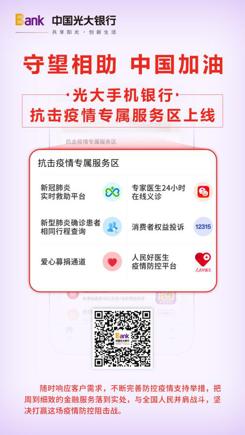 其中,專家醫(yī)生24小時在線義診是由光大銀行與平安好醫(yī)生APP合作推出,可在線免費提供專家醫(yī)生義診服務(wù),并提供多類常見藥物的購買服務(wù);新冠肺炎實時救助平臺是由光大銀行與微醫(yī)互聯(lián)網(wǎng)總醫(yī)院聯(lián)合上線,平臺可提供最新疫情動態(tài)、疫情防御、7*24小時在線免費專業(yè)醫(yī)生咨詢等功能;愛心募捐通道提供多個渠道的賑災(zāi)捐款項目,讓愛心匯聚防控疫情斗爭第一線;人民好醫(yī)生疫情防控中央平臺第一時間科普權(quán)威知識,公布疫情防護(hù)物資供需發(fā)布;確診患者相同行程查詢功能可為客戶提供火車車次、飛機航班號、城市等方式,查看是否有肺炎患者同行。