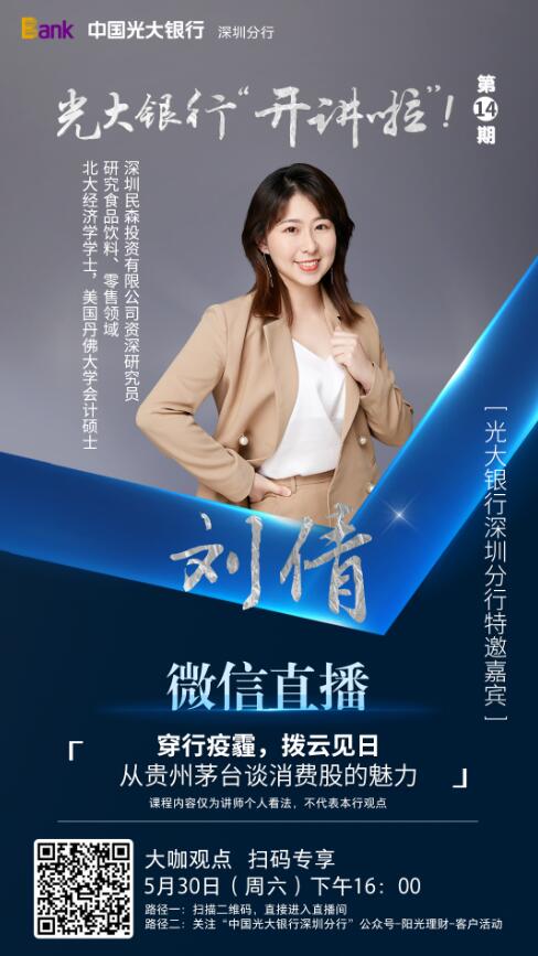 此次,光大銀行深圳分行攜手鳳凰深圳財(cái)經(jīng),邀請(qǐng)到北大經(jīng)濟(jì)學(xué)碩士、美國(guó)丹佛大學(xué)會(huì)計(jì)碩士、深圳民森投資有限公司資深研究員劉倩女士,在線為客戶帶來(lái)《穿行疫霾,拔云見(jiàn)日——從貴州茅臺(tái)看消費(fèi)股的魅力》主題分享。據(jù)悉,劉倩女士關(guān)注于食品飲料、零售領(lǐng)域的投資研究。此次分享,她以眾所熟知的茅臺(tái)酒為案例,結(jié)合A股2000年至2018年漲幅數(shù)據(jù)、茅臺(tái)歷史、品牌發(fā)展、銷售渠道、市場(chǎng)占有等多方面,介紹孕育牛股搖籃的消費(fèi)股投資邏輯,幫助更多客戶在全球受疫情沖擊、經(jīng)濟(jì)不確定時(shí)期,了解A股牛股市場(chǎng)邏輯、知曉投資策略提升個(gè)人資產(chǎn)。
