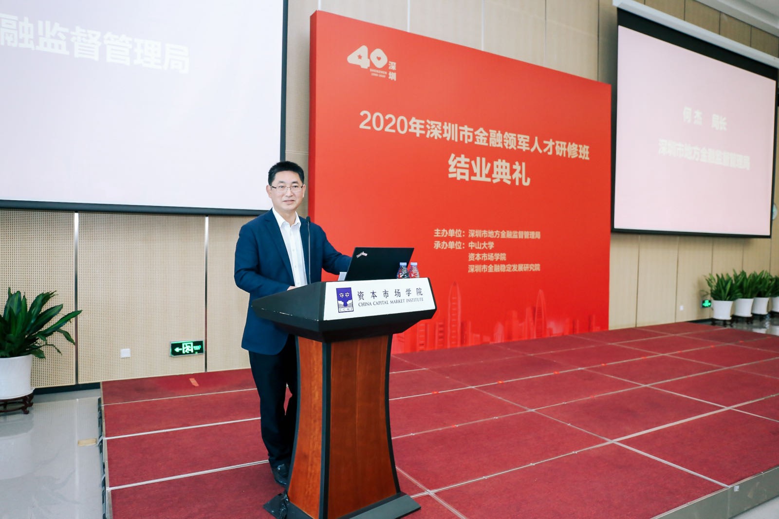 1月30日上午,2020年深圳金融領(lǐng)軍人才研修班結(jié)業(yè)典禮在資本市場學(xué)院隆重舉辦。本期研修班由深圳市地方金融監(jiān)督管理局主辦,中山大學(xué)、資本市場學(xué)院、深圳市金融穩(wěn)定發(fā)展研究院共同承辦。市地方金融監(jiān)管局黨組書記劉平生主持結(jié)業(yè)典禮并致辭,局長何杰作總結(jié)講話。資本市場學(xué)院副理事長、深圳市原副市長唐杰教授,資本市場學(xué)院黨委書記陳自強(qiáng)、院長金立揚(yáng)、副院長張韶輝,深圳銀保監(jiān)局副局長陳飛鴻、深圳證券交易所紀(jì)委書記邢力紅,市地方金融監(jiān)督管理局副巡視員林居正,中山大學(xué)嶺南學(xué)院院長陸軍教授,以及市委組織部、人民銀行深圳市中心支行、深圳證監(jiān)局有關(guān)領(lǐng)導(dǎo)應(yīng)邀出席,本期研修班近110名學(xué)員參加活動。