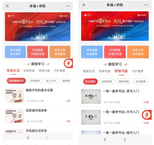 中信銀行專門給老年朋友準(zhǔn)備的“課程學(xué)習(xí)”一共有智能生活、悅享財(cái)富、琴棋書畫和守護(hù)健康四大板塊,都是老年朋友需要和關(guān)心的內(nèi)容,總課程2000余節(jié),總時(shí)長(zhǎng)超過1.8萬分鐘。