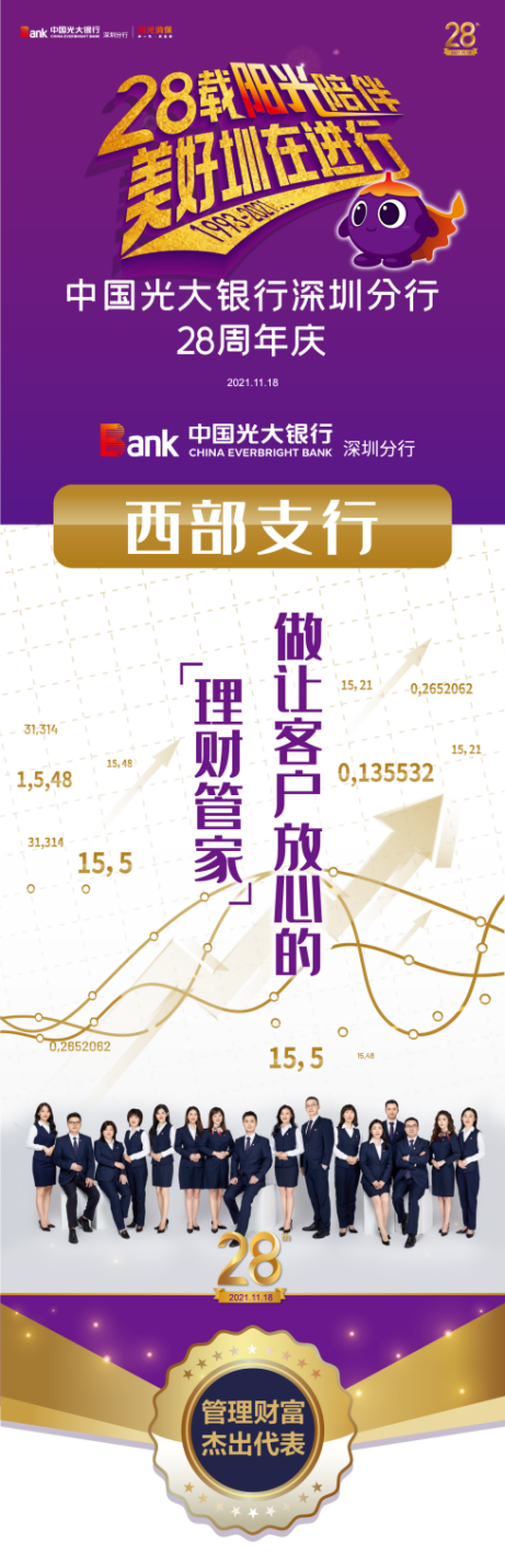 作為財富管理業(yè)務(wù)的先行者,光大銀行一直致力追求做讓客戶放心的“理財管家”。西部支行始終堅定朝著總分行打造“一流財富管理銀行”的戰(zhàn)略目標(biāo)方向趕超奔跑,建設(shè)專業(yè)的財富管理團(tuán)隊,管理財富,服務(wù)民生。在光大銀行深圳分行28周年的“十大最美光陰故事”管理財富類評選中,西部支行脫穎而出,獲評管理財富杰出代表。