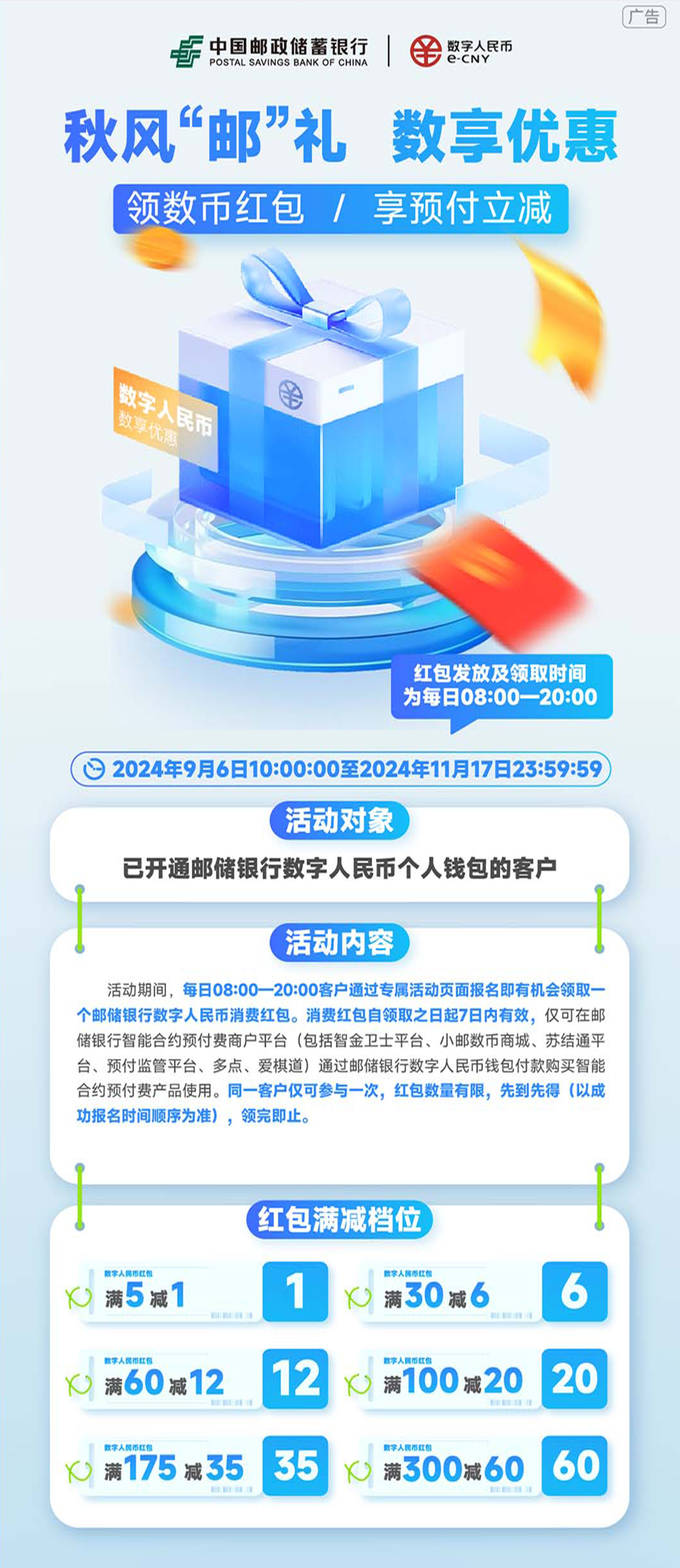 2024年9月6日10:00至2024年11月17日23:59,已開通郵儲(chǔ)銀行數(shù)字人民幣錢包的客戶,活動(dòng)期間,每日08:00-20:00客戶通過(guò)專屬活動(dòng)頁(yè)面報(bào)名即有機(jī)會(huì)領(lǐng)取一個(gè)郵儲(chǔ)銀行數(shù)字人民幣消費(fèi)紅包。消費(fèi)紅包自領(lǐng)取之日起7日內(nèi)有效,僅可在郵儲(chǔ)銀行智能合約預(yù)付費(fèi)商戶平臺(tái)(包括智金衛(wèi)士平臺(tái)、小郵數(shù)幣商城、蘇結(jié)通平臺(tái)、預(yù)付監(jiān)管平臺(tái)、多點(diǎn)、愛棋道)通過(guò)郵儲(chǔ)銀行數(shù)字人民幣錢包付款購(gòu)買智能合約預(yù)付費(fèi)產(chǎn)品使用。同一客戶僅可參與一次,紅包數(shù)量有限,先到先得(以成功報(bào)名時(shí)間順序?yàn)闇?zhǔn))領(lǐng)完即止。