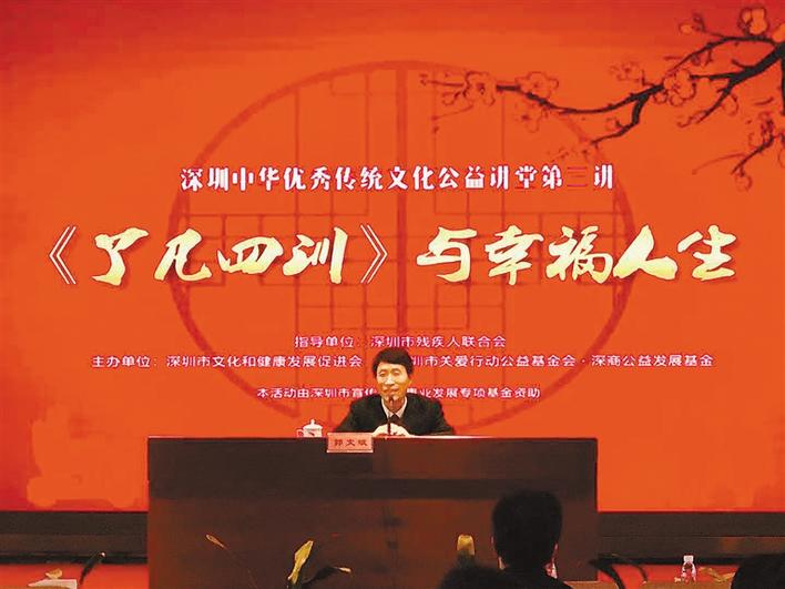 深圳商報(bào)2019年03月18日訊 (記者 夏和順/文 韓墨/圖)近日,深圳中華優(yōu)秀傳統(tǒng)文化公益講堂第三場(chǎng)在深圳市殘疾人綜合服務(wù)中心開(kāi)講,這也是傳統(tǒng)文化講堂首次“送課上門(mén)”。著名作家郭文斌與市殘聯(lián)系統(tǒng)200多名干部分享“東方勵(lì)志奇書(shū)”《了凡四訓(xùn)》所蘊(yùn)含的人生哲理,探討“安詳生活理念”與幸福人生的關(guān)系。據(jù)介紹,本次活動(dòng)由中華炎黃文化研究會(huì)文明傳承委員會(huì)、深圳市文明辦指導(dǎo),深圳市文化與健康發(fā)展促進(jìn)會(huì)主辦。