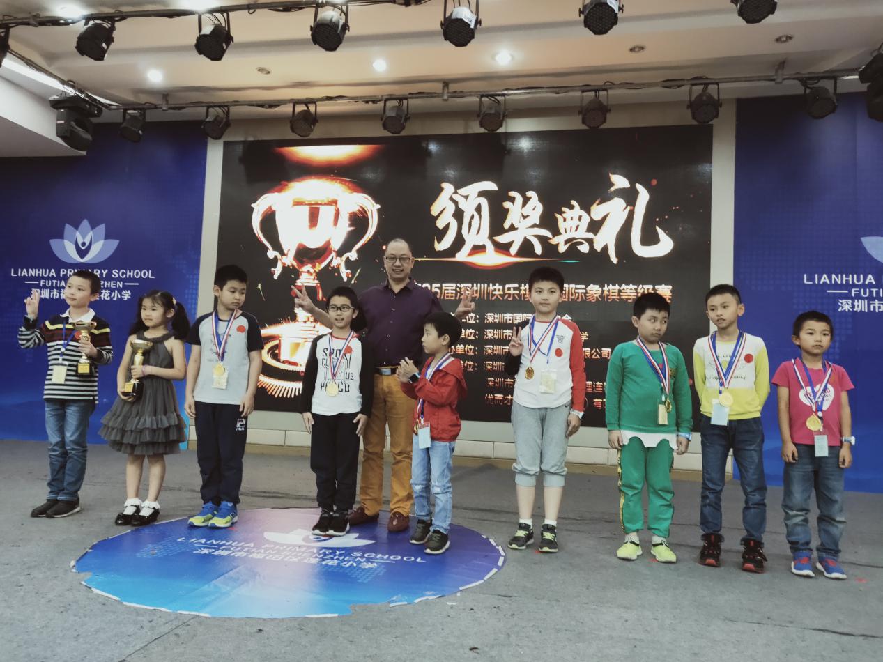 福田區(qū)蓮花小學(xué)校長(zhǎng)王華斌先生為獲獎(jiǎng)棋手頒獎(jiǎng)