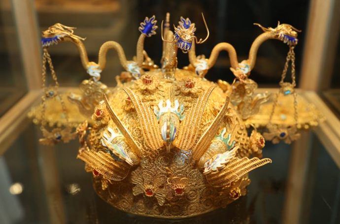 此次文博會,楚釹子品牌展出鳳冠霞帔婚配系列、宅配梅蘭竹菊系列、佛像系列產(chǎn)品等近百余件。其中鳳冠霞帔系列作品,以巧妙的花絲鑲嵌技藝,糅合中國傳統(tǒng)技藝,融入現(xiàn)代婚紗設計理念,打造出流光溢彩、雍容華貴的現(xiàn)代宮廷藝術(shù)之美。