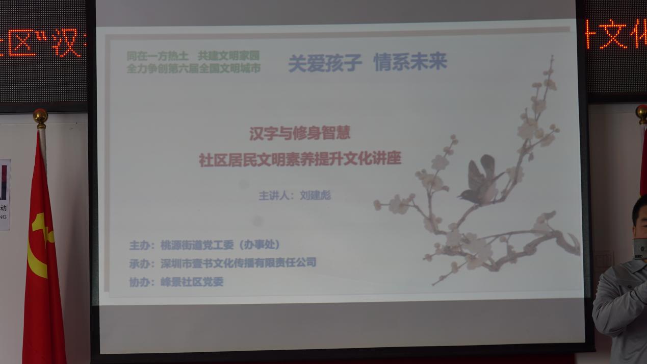 11月8日下午,該項目首場講座在峰景社區(qū)工作站拉開了序幕,本次講座由桃源街道黨工委(辦事處)主辦、深圳市壹書文化傳播有限責任公司承辦、峰景社區(qū)黨委協(xié)辦,邀請到壹讀書會創(chuàng)始人、知名閱讀推廣人、《漢字與修身智慧》的作者劉建彪擔任主講嘉賓。在深圳爭創(chuàng)全國文明城市的當下,桃源街道辦積極響應市委市政府的號召,不斷探索籌劃、推陳出新,以“‘同在一方熱土共建文明家園’——全力爭創(chuàng)第六屆全國文明城市”為文明創(chuàng)建標語,開展題為“學習漢字與修身智慧,以傳統(tǒng)文化力量促文明”的文化講座,為創(chuàng)建文明城市貢獻一份力量。