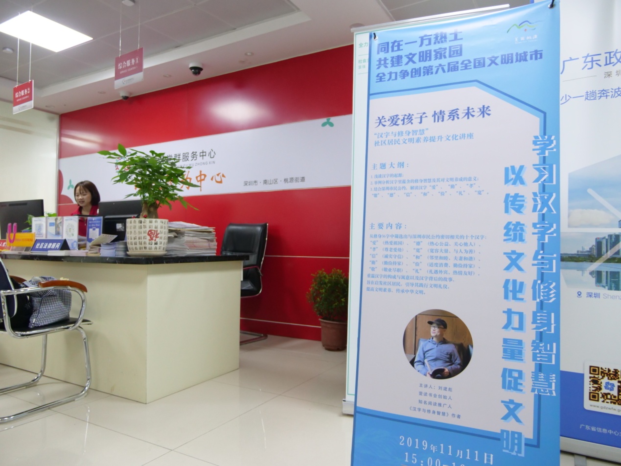 11月11日下午,本系列活動(dòng)的第三場(chǎng)講座在平山社區(qū)工作站拉開(kāi)了序幕,此次講座由桃源街道黨工委(辦事處)主辦、深圳市壹書文化傳播有限責(zé)任公司承辦、平山社區(qū)黨委協(xié)辦。從2005年起,深圳連續(xù)五次獲得“全國(guó)文明城市”的榮譽(yù)稱號(hào),在爭(zhēng)創(chuàng)第六屆全國(guó)文明城市的關(guān)鍵時(shí)期,桃源街道辦積極響應(yīng)市委市政府的號(hào)召,堅(jiān)持求真務(wù)實(shí)的工作作風(fēng),以“‘同在一方熱土共建文明家園’——全力爭(zhēng)創(chuàng)第六屆全國(guó)文明城市”為文明創(chuàng)建標(biāo)語(yǔ),開(kāi)展題為“學(xué)習(xí)漢字與修身智慧,以傳統(tǒng)文化力量促文明”的文化講座,為創(chuàng)建文明城市貢獻(xiàn)一份力量。
