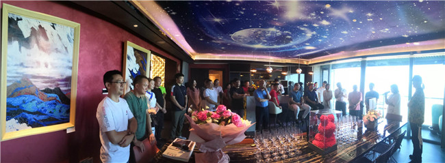 樊鴻賓美術(shù)館座落在珠海市香洲區(qū)內(nèi),旁接情侶路,目眺鳳凰灣,一派浪漫情調(diào),真是一塊滋養(yǎng)藝術(shù)的風(fēng)水寶地。展館所在的天宸大廈十六樓。面朝大海,視野開闊,藍(lán)天白云,碧海揚(yáng)帆,讓人心曠神怡。與此同時(shí),室內(nèi)樂(lè)聲輕伴、紅酒飄香,此景、此情映襯之下,緩步巡看展品,或細(xì)細(xì)靜賞佳作,自然而然有一份莫名舒適的藝術(shù)享受。