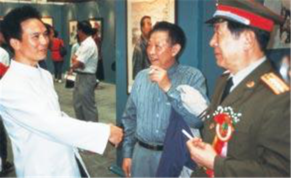 時(shí)任深圳警備區(qū)司令李友烈(右)在金龍陪同下參觀畫展。