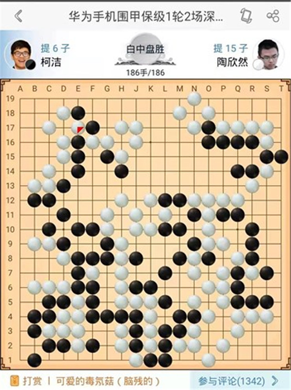 主將臺由深圳隊陶欣然八段執(zhí)白對陣民生隊的柯潔九段。開局右下角黑棋行棋次序錯誤,遭到白棋反擊。黑棋沖動的選擇打劫轉(zhuǎn)換,轉(zhuǎn)換后白棋已經(jīng)勝勢。之后黑棋左邊頑強(qiáng)制造打劫,再次形成轉(zhuǎn)換依然局面大差。之后黑棋又在上邊挑起劫爭,白棋劫材很多,黑認(rèn)負(fù),陶欣然中盤勝柯潔。陶欣然達(dá)成對世界第一人的三連勝。