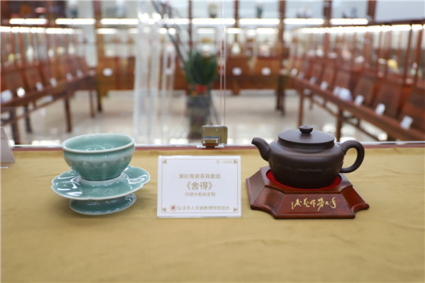再就是印順大和尚倡意定制的帶有濃厚佛教色彩的生活用具,如紫砂、青瓷茶具套組《舍得》,景德鎮(zhèn)描金茶具“六度”系列《荷順》,均有以佛教意象蓮花為內(nèi)容的圖案或造型,讓人在使用時(shí)頓生清靜心、倍感佛法力,或可為信眾修行悟道助一臂之力。
