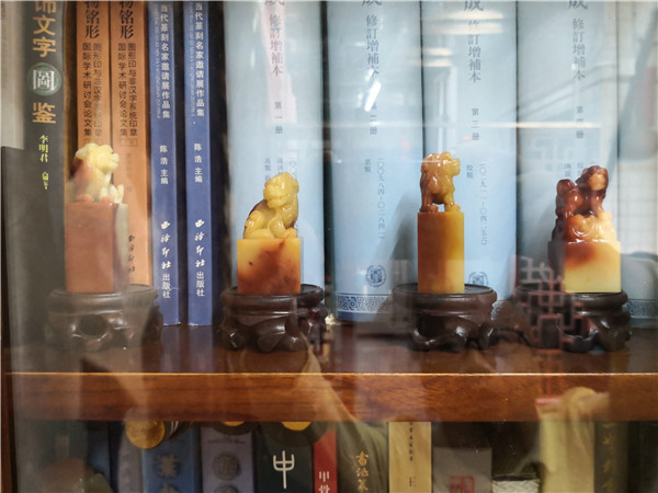 書房約莫20平米不到,擺設(shè)裝點(diǎn)里透射出寧老師的日常。當(dāng)陽光照進(jìn)這間寧靜的小屋,他習(xí)慣于先打開音樂,在舒心樂聲中開始他一天讀書、刻印的生活。累了,在小桌上喝喝茶,或彈上一段古琴,或者玩賞一下他收藏的心愛鈴鐺。據(jù)介紹,他專門收藏西北一帶富貴人家的馬鈴,目前有100余個。寧老師說,“讀書、養(yǎng)性、積德、延年”是其志向,井井有條、一絲不茍的書房就是佐證。長期的濡養(yǎng),讓人感到寧老師的談吐從容、情趣高雅、思想深刻。映照在篆刻上,寧老師的印作也日漸沉穩(wěn)大氣,除姓名印章外,所刻內(nèi)容啟人心智,如“以正大立心”“以光明行事”“修辭立其誠”等等。