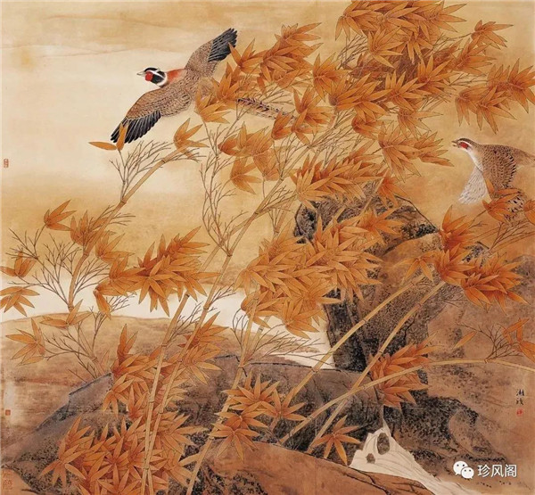在構圖上,他往往打破傳統(tǒng)工筆花鳥畫中的一些常見程式,講究“起承轉合”“賓主揖讓”與“呼應關系”,強調(diào)構圖布勢的“自然天成”;在勾勒上,注重墨分五色,焦、濃、重、淡、清,用筆的墨色根據(jù)不同對象、不同結構而進行變化,筆法的起落、轉折、頓挫都與表現(xiàn)的形象、性質有極密切的關系;在用色上,他一改當代一部分花鳥畫流于程式、設色濃艷匠氣的弊端,而是集合多種畫法,在傳統(tǒng)固有色中融入西洋畫法的色彩規(guī)律,追求整體色調(diào)的對比與協(xié)調(diào),所以其作品體現(xiàn)出不同于傳統(tǒng)工筆花鳥畫的意境和氛圍。
