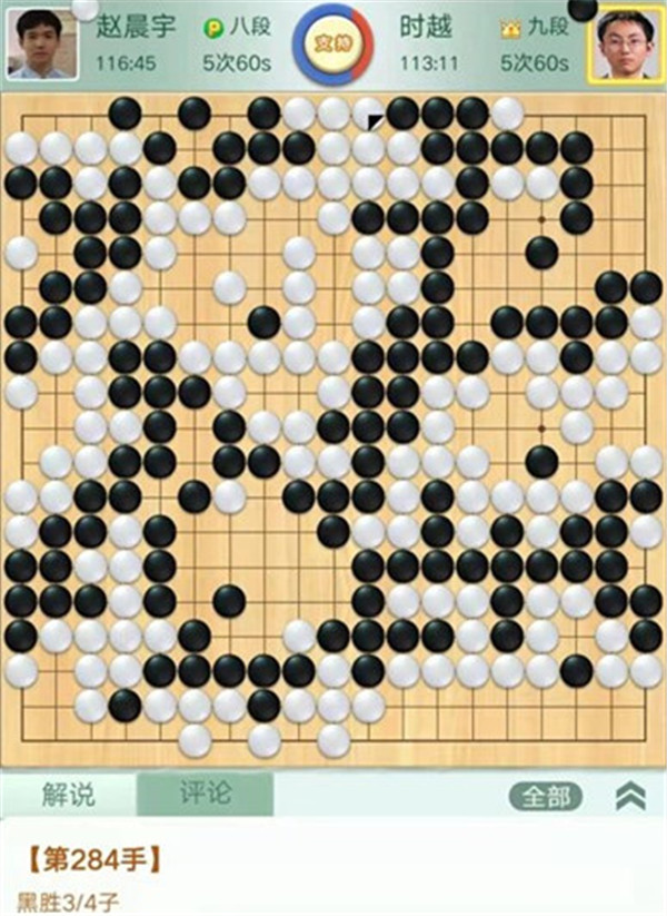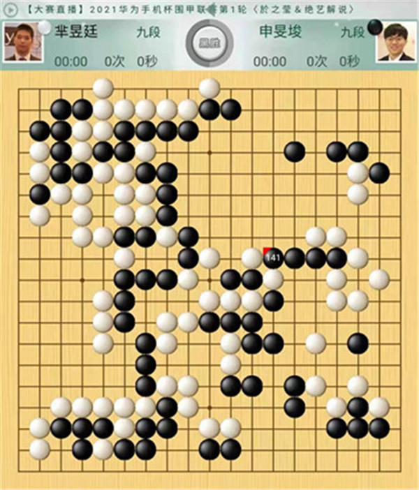 今日比賽中,申旻俊主將執(zhí)黑對陣新二冠羋昱廷,開局左上角申旻俊配合小米使出羋氏飛刀,結(jié)果是飛刀不成功黑棋局面領(lǐng)先。中盤黑棋攻擊中央白棋時(shí),白棋脫先搶占實(shí)地。被黑手起刀落斬殺大龍,局終??炱迮_,去年屢立戰(zhàn)功的戎毅七段執(zhí)白對陣黃云嵩七段,行棋穩(wěn)健,占居三個(gè)角之后,又在中間活出一大塊,行棋至194手勝。三臺陶欣然八段對陣陳賢八段,行棋222手白中盤勝。四臺時(shí)越九段對趙晨宇一戰(zhàn),行至284手,以四分之三子微弱優(yōu)勢取勝。