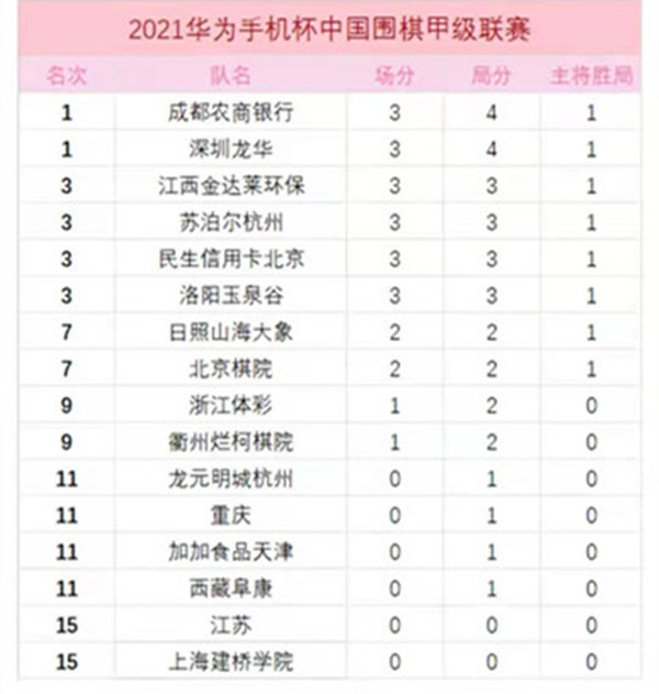 第一輪其余參賽各隊(duì)?wèi)?zhàn)況如下:成都農(nóng)商銀行隊(duì)4:0勝上海建橋?qū)W院隊(duì);西藏阜康1:3洛陽玉泉谷;蘇泊爾杭州3:1加加食品天津;民生信用卡北京隊(duì)3-1龍?jiān)鞒呛贾?。首輪過后,深圳、成都隊(duì)居第一方陣;江西、杭州、北京、洛陽居第二方陣。圍甲積分榜排名如下: