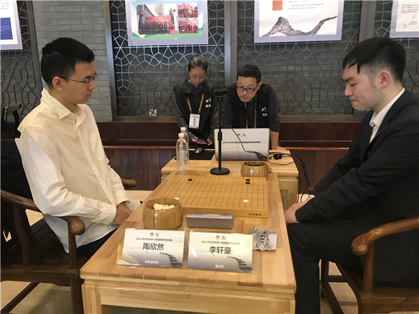 四臺(tái)陶欣然執(zhí)白對李軒豪一局,甫一開始就圍繞“羋氏飛刀”定式引發(fā)的雙征子進(jìn)入纏斗狀態(tài),極其精采,其后,黑棋棄掉左下后在右邊形成巨大模樣。白棋后半盤局面判斷失誤,手法過于平淡,沒有尋求在黑棋模樣中獲得更大便宜的下法。最終白棋以1又3/4子差距落敗。