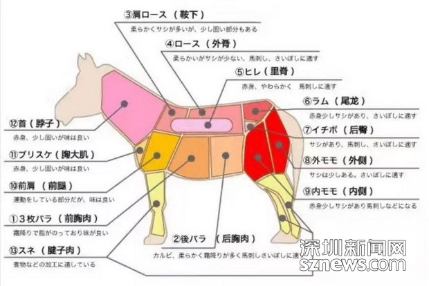 馬能做成刺身的部位相當(dāng)?shù)挠邢蓿勒沼突ǚ植即笾驴梢苑譃楦谷?卜口)、霜降、赤身等不同的等級(jí)。其中最稀有的的“三枚腹”肉,一匹五百公斤的馬只能產(chǎn)出大約5-6公斤,肉質(zhì)口感近似于藍(lán)鰭金槍魚(yú)中腹肉。