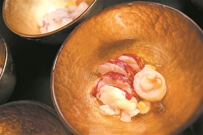 頭盤(pán) “荷塘魚(yú)趣”,主角黃花魚(yú)來(lái)自世界第三大江——長(zhǎng)江。步步生蓮是東方禪意,蓮子依依是情誼,蓮藕結(jié)結(jié)是路路通達(dá),Alvin Leung此次演繹的中式料理充滿東方元素,表達(dá)的是和諧交融。主菜“日式鮮味香烤和?!笔侨毡局鲝NHisamitsu Hataji 之作,他用創(chuàng)新手法融入經(jīng)典的日式料理中,表達(dá)一年四季食材與味道的關(guān)系,這是關(guān)于美食的光陰的故事。甜品出自Clement之手,是晚宴甜蜜的句號(hào)。
