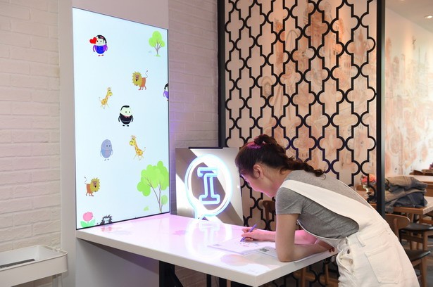 餐廳中心區(qū)域設置了一款風靡全球的“奇妙涂鴉”互動游戲,只需用蠟筆或微信小程序涂鴉,就能親眼見證自己填色的靜態(tài)畫像活靈活現(xiàn)地走入桌面走上墻壁,人人均可當一回“神筆馬良”,用創(chuàng)意打開無限想象,邊吃邊玩,將用餐變成一種愉悅的享受。