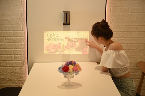 除了“情緒地帶”,智慧餐廳還提供了多元化的互動服務。門店等位區(qū)有一整面具有奇幻動感效果的投影互動墻,通過獨特的觸摸啟動可以探索必勝客的比薩從原料種植、加工、生產(chǎn),一直到制作成品、奉客、外送等一系列過程,為顧客提供趣味十足的多感官虛擬互動體驗,讓無聊的等位時間也變得興味盎然。