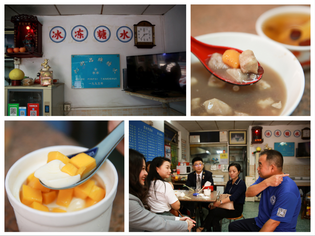 在禮賓司的引領(lǐng)下,大家來(lái)到已有千年歷史的文化遺產(chǎn)——南頭古城。一行人在“九街糖水鋪”入座,店主夫妻倆熱情的端出清甜可口的化州糖水和香氣四溢的潮州炒米粉,和我們嘮起了家長(zhǎng)里短。大家方才得知,這宛如尋常百姓家的糖水鋪竟開(kāi)業(yè)于1995年,見(jiàn)證了古城九街的變遷翻新和故去新來(lái)的幾代人潮川流。帶著傳播化州糖水美名初衷的糖水世家選擇在深圳發(fā)家,傳到這已是第三代。眾人大快朵頤,禮賓司也幫忙跑堂添茶。