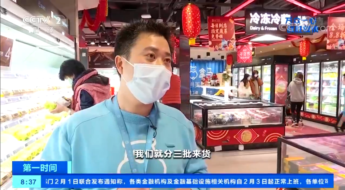 “排面要整理一下?!眮碜院钡溺娞炱绞呛旭R鮮生超市員工,他告訴記者,春節(jié)前,因?yàn)殛懤m(xù)看到疫情的消息,他和愛人取消了返鄉(xiāng)的車票,但這也是他這么多年來所經(jīng)歷的,最不尋常的一個。初一初二休息的鐘天平,大年初三就碰上了搶購?!邦櫩团砰L隊,從9點(diǎn)鐘排隊排到1點(diǎn)鐘左右,貨架上的蔬菜、肉以及禽蛋奶,甚至是油米面都被一掃而空。”