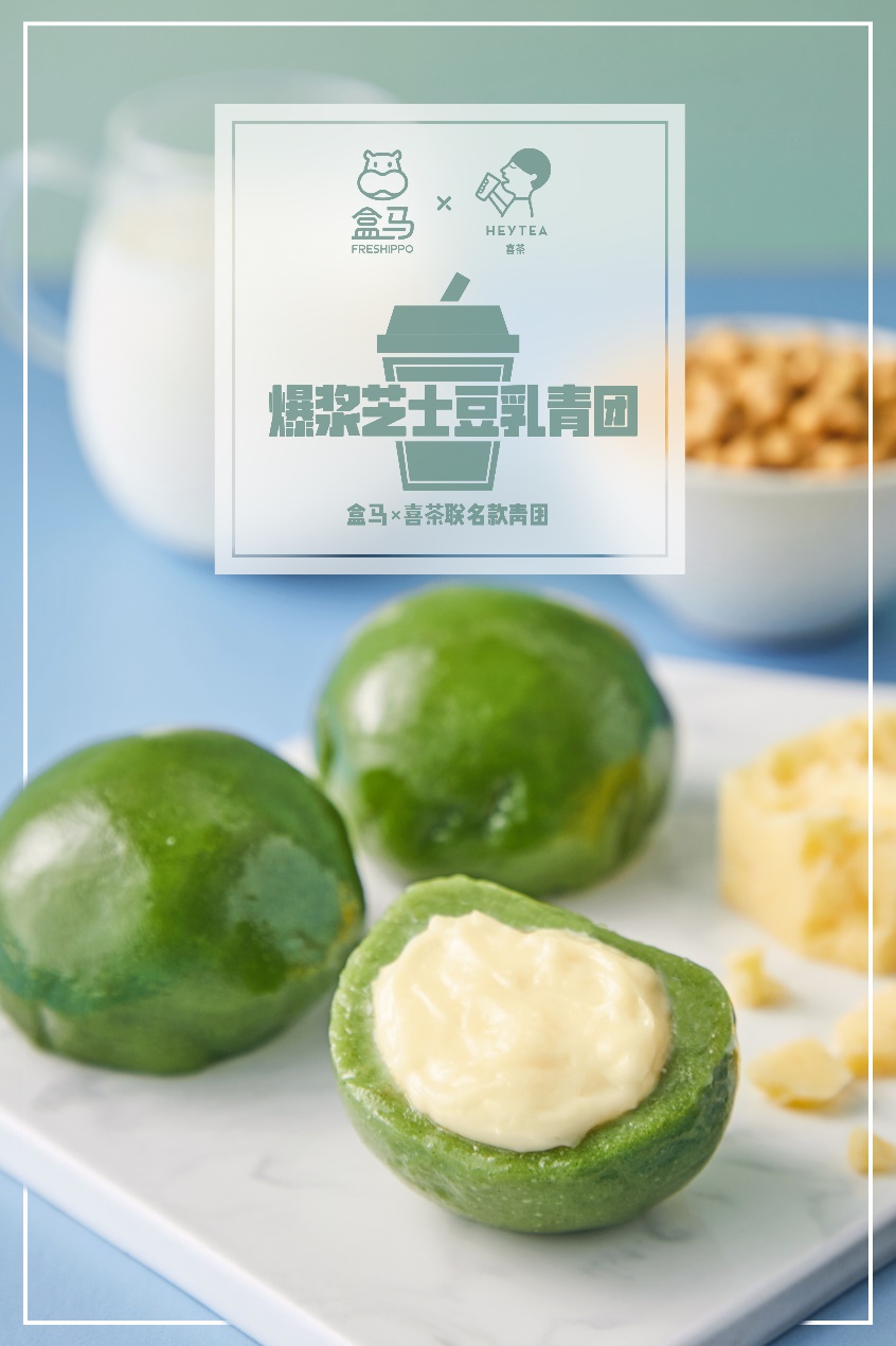 如何將流質(zhì)的奶茶包進(jìn)固態(tài)的青團(tuán)中,是令盒馬小二最頭疼的問(wèn)題。阿華田波波青團(tuán)中,她嘗試著加入芋泥,不僅實(shí)現(xiàn)了將喜茶兩款熱門飲品(阿華田波波、芋泥波波)的口味相結(jié)合,還增加了餡心的厚實(shí)度,吃起來(lái)口感更加豐滿。而在爆漿芝士豆乳青團(tuán)中,盒馬的日日鮮醇豆?jié){派上了用場(chǎng);11度的高濃度豆?jié){味道香醇,也更加濃稠。