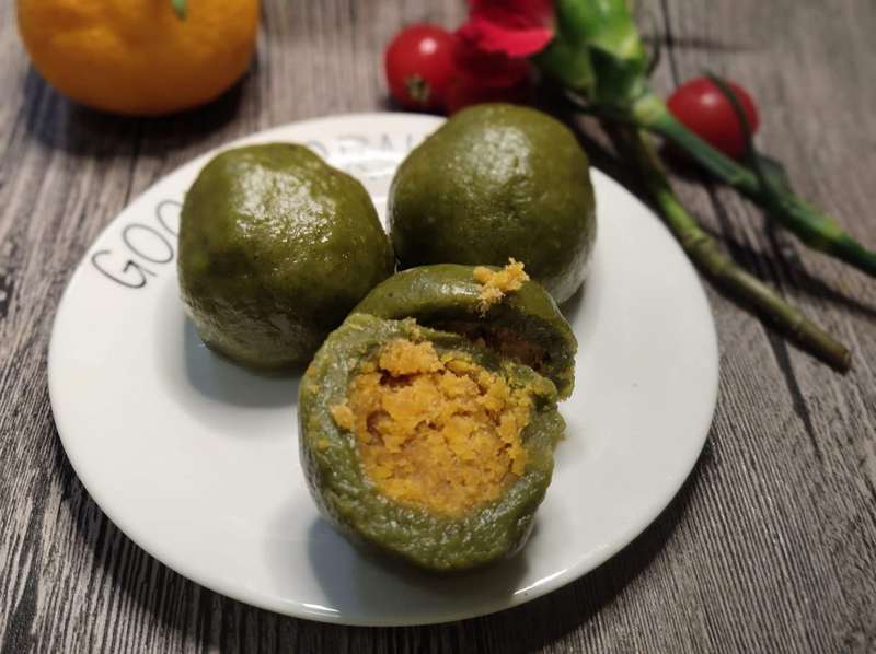 實際上,如果單純用艾草做青團(tuán)子,蒸熟后顏色暗沉偏黃,不一定特別好看,所以也有粵菜師傅發(fā)明一種改良的做法:用菠菜汁和艾葉汁混合,青團(tuán)子就呈現(xiàn)鮮綠的顏色。餡料方面,除了可以用最傳統(tǒng)的花生糖餡料,也可以用很多年輕人喜愛的咸蛋肉松餡,咸甜任君選擇。