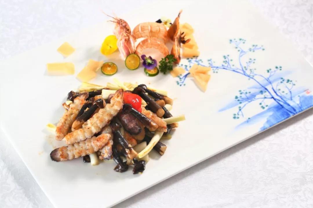 皮皮蝦焯熟以后過冰,剪去邊緣的刺,再完整拆出肉來,拍上少許味料與生粉,煎到兩面呈金黃色。然后加入蕎菜翻炒片刻即可。除了這二者之外,還會配爽口的黑雞樅。