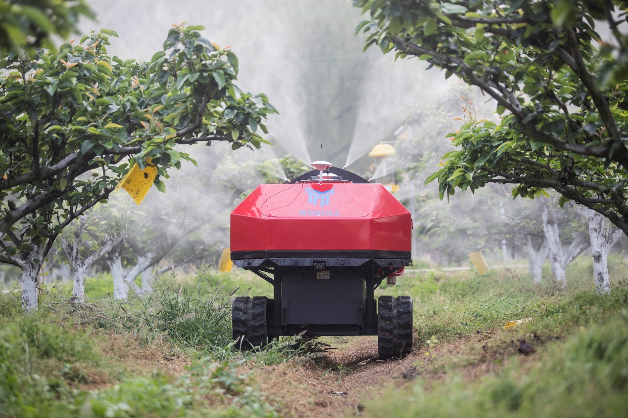 (翠冠梨數(shù)字農(nóng)業(yè)基地的無人值守果園機(jī)器人正在田間施藥,農(nóng)民可遠(yuǎn)程操控)