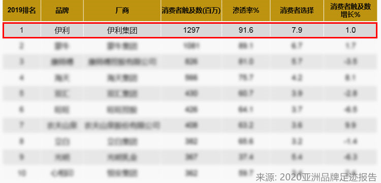 見圳客戶端·深圳新聞網(wǎng)2020年6月23日訊 日前,凱度消費者指數(shù)發(fā)布了《2020亞洲品牌足跡報告》。伊利憑借91.6%的品牌滲透率、近13億的消費者觸及數(shù)和近8次的購買頻次,連續(xù)五年位列中國市場消費者選擇最多的品牌榜首。綜合報告數(shù)據(jù)顯示,伊利各項指標在榜單中領先于其他品牌,持續(xù)領跑中國快消品市場。