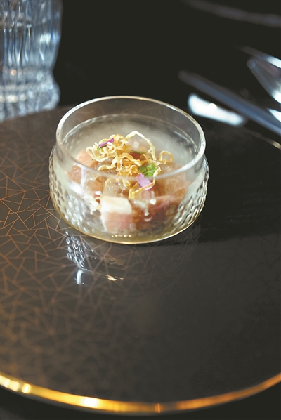煙焯,當廚者將眼前的玻璃罩打開時,撲鼻而來的是蘋果木的煙熏香氣,閉目吸了一口氣,爾后才動勺。先將其中的金槍魚tata與炸過的洋蔥和檸檬葉絲等輕輕攪拌,然后開吃。據主理人彪哥介紹,撈起是順德魚生的吃飯演變而來,金槍魚tata是日式元素,煙熏是西餐中常用的技法。