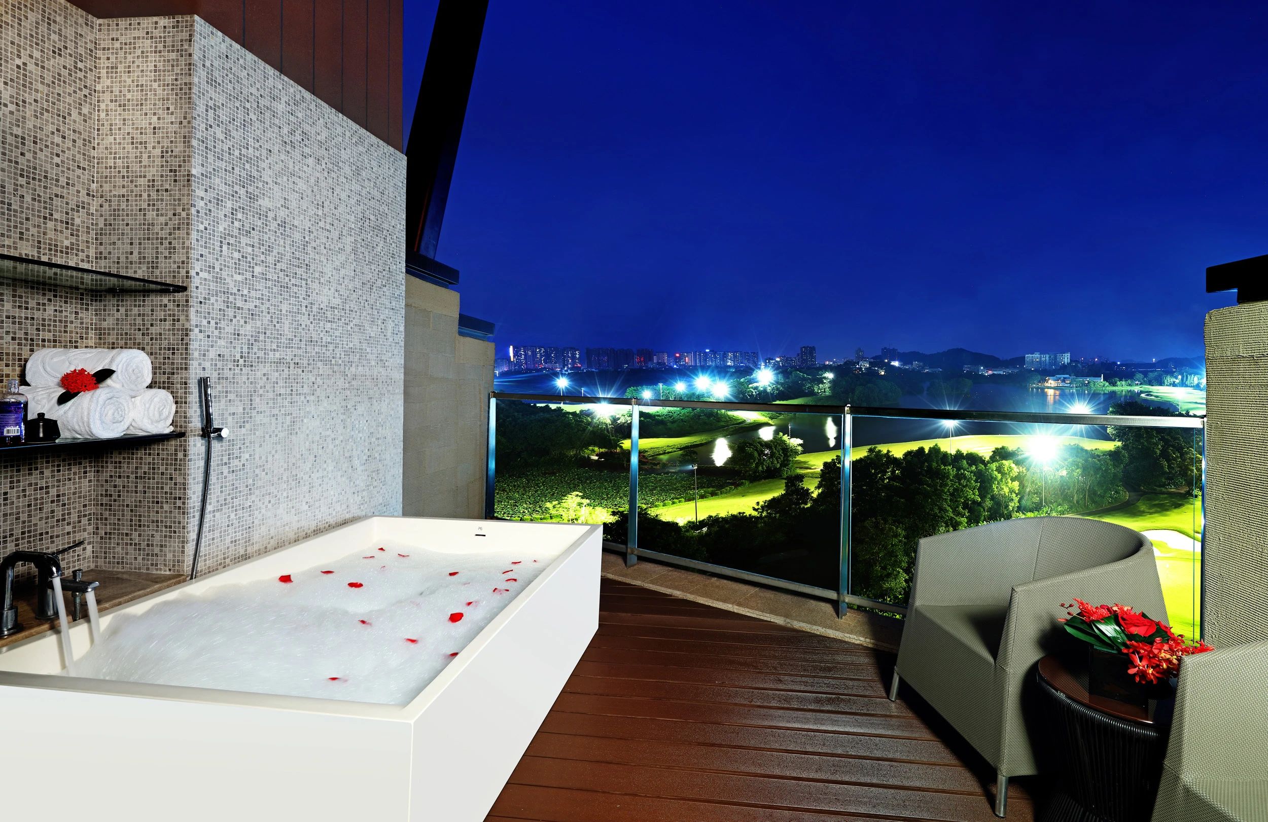 酒店大手筆地設(shè)置了單側(cè)客房,只為220間房都能直面250萬(wàn)㎡高爾夫果嶺景觀。而且大部分都配備了陽(yáng)臺(tái)浴缸,可以對(duì)著山水泡澡,私密性也極好。